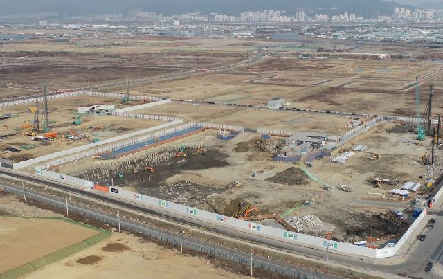 전매 제한이 1년으로 완화된 에코델타시티에서 공사가 진행 중이다. 부산도시공사 제공 2023.02.15 부산일보DB