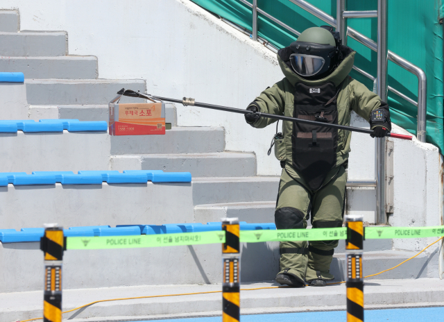23일 부산 아시아드 보조경기장에서 열린 한국·태평양 도서국 정상회의 대비 유관기관 합동 대테러 종합훈련에서 폭발물처리반이 폭발물을 처리하고 있다. 이번 훈련은 콘서트 개최 중 테러범이 사제 폭발물을 이용해 인질을 붙잡은 것을 가정한 상황에서 실시됐다.