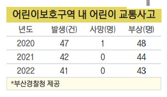 23일 부산경찰청에 따르면 지난해 부산의 어린이보호구역에서 일어난 교통사고는 모두 90건이었다. 이 중 어린이가 다친 사고는 41건이었다. 4일에 한 번씩 어린이보호구역에서 교통사고가 발생했고, 9일에 한 번씩 어린이보호구역에서 사고를 당한 어린이가 생긴 셈이다. 2021년의 경우 전체 교통사고 건수는 100건, 어린이가 다친 사고는 42건이었다. 1년 사이에 사고 건수가 줄기는 했지만 매우 소폭에 그쳤다.