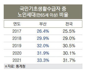23일 부산시 등에 따르면 부산의 기초생활수급자 중 만 65세 이상 노년층 비율은 최근 5년 동안 지속적으로 증가했다. 기초생활수급자 중 노인 세대 비율은 2017년 26.4%였지만 2019년에는 32%로 증가했다. 2021년에는 전체 기초생활수급자 중 3분의 1인 33.3%를 차지했다. 기초생활수급자 중 노년층이 차지하는 비율은 전국적으로 느는 추세이지만 부산의 경우 전국 평균을 웃돌아 노인 빈곤 문제가 더욱 심각한 것으로 나타났다.