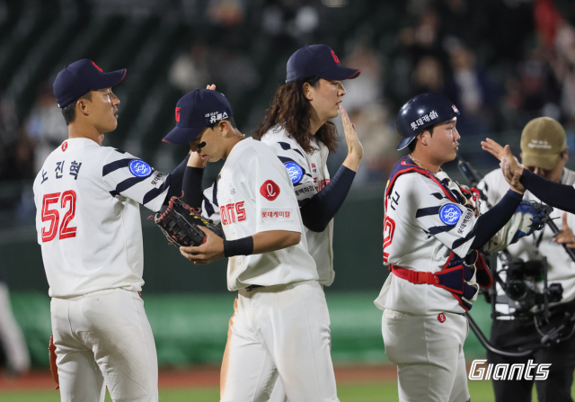 롯데 자이언츠는 23일 열린 NC 다이노스와의 홈 경기에서 2-0으로 승리했다. 롯데 선수들이 경기가 끝난 뒤 하이파이브를 하고 있다. 롯데 자이언츠 제공