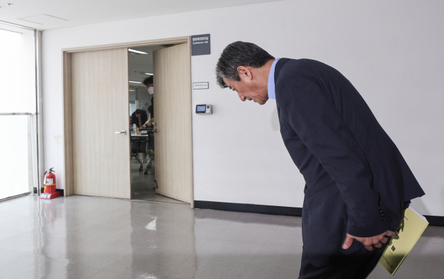 부산국제영화제 이용관 이사장이 24일 임시이사회가 열린 부산 영화의전당 대회의실로 고개를 숙이며 들어가고 있다. 김종진 기자 kjj1761@