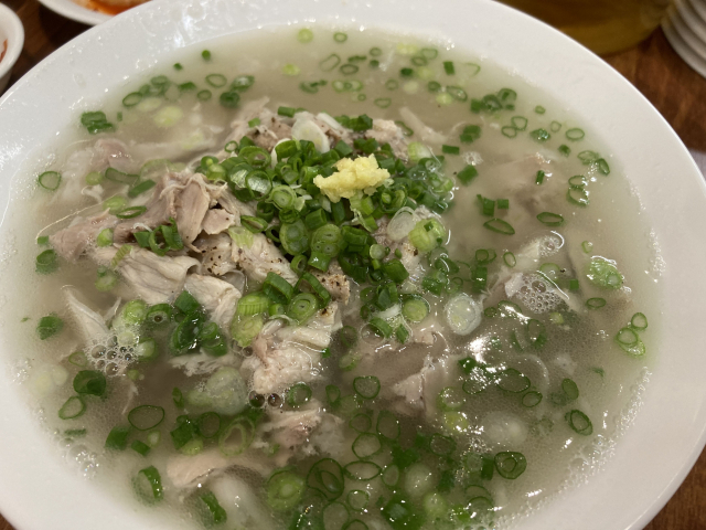 돼지곰탕은 90%의 채소 육수와 10%의 돼지 사골육수로 만든다고 한다. 맑은 국물이다.
