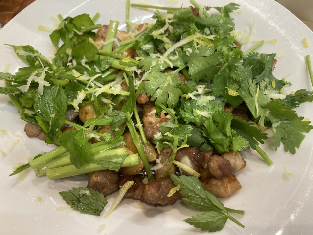 이왕 온 김에 이것저것 먹어보자 싶어 삼겹구이를 주문했다. 삼겹구이는 통마늘을 넣어 '전용 구이 기계'로 구워내고 있었다. 삼겹구이 기계가 빙빙 돌아가며 내부의 고기와 마늘을 먹기에 가장 적당한 맛으로 구워주는 것. 취향에 따라 고수를 얹어 먹는다. 고수 좀 많이 달라고 했다.