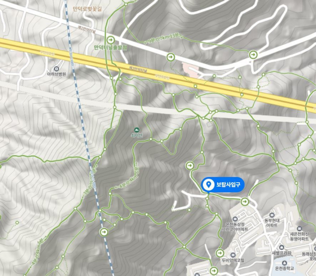 만덕고개에서 이정표가 잘 돼 있고, 보탑사 입구에도 등산로 안내가 잘 돼 있다. 산길이 여러 갈래로 많으나 위로 오르면 금백종주길(금정산~백양산) 주능선이자 낙동정맥 능선에 도달하기에 주능선에 올라도 크게 문제될 건 없다. 이번 코스는 능선에 오르는 것이 아니라 산허리를 가로지르면서 완만한 산책형 등산을 할 수 있다. 토질이 마사토라 미끄러우니 낮다고 얕보지 말고 운동화보다는 등산화를 신어야 한다.