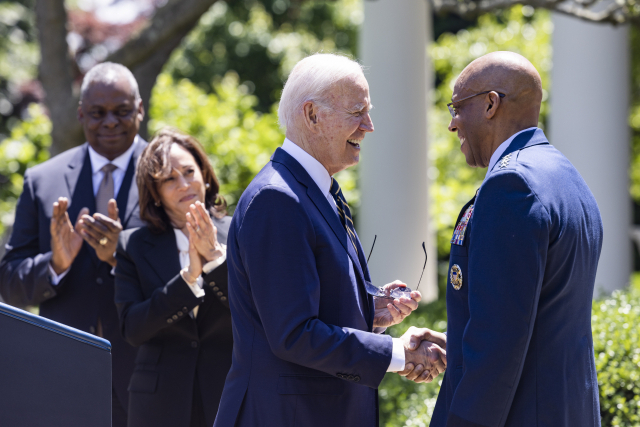 조 바이든 미국 대통령(오른쪽에서 두번째)이 지난 25일(현지 시간) 워싱턴DC 백악관 로즈가든에서 차기 합참의장으로 찰스 브라운 공군참모총장(오른쪽)을 공식 지명한 뒤 악수하고 있다. EPA연합뉴스