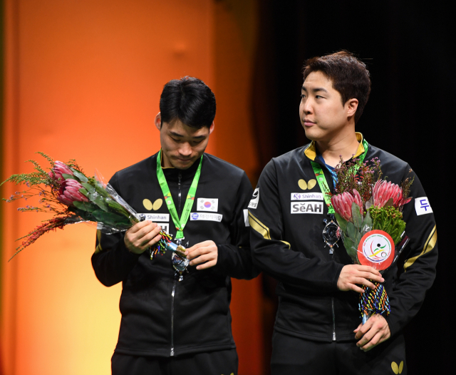 27일(한국시간) 남아프리카공화국 더반에서 열린 국제탁구연맹(ITTF) 개인전 세계선수권대회 남자복식에서 은메달을 수확한 장우진(왼쪽)-임종훈 조 시상식에서 아쉬운 표정을 짓고 있다. 신화연합뉴스