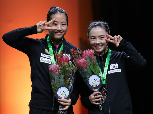 28(한국시간) 남아프리카공화국 더반에서 열린 2023 국제탁구연맹(ITTF) 개인전 세계선수권대회 여자복식에서 은메달을 딴 신유빈(왼쪽)과 전지희가 환하게 웃고 있다. 신화연합뉴스