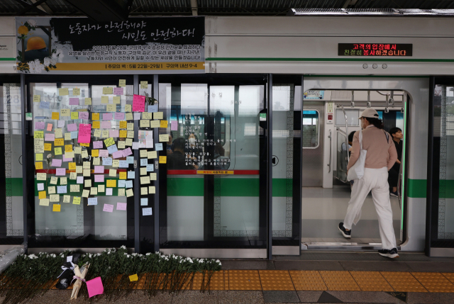 지하철역 승강장 안전문을 점검하다 숨진 ‘구의역 김 군 사망 사고’ 7주년인 28일 서울 광진구 지하철 구의역 9-4 승강장 사고 현장에 추모 메시지들이 붙어 있다. 연합뉴스