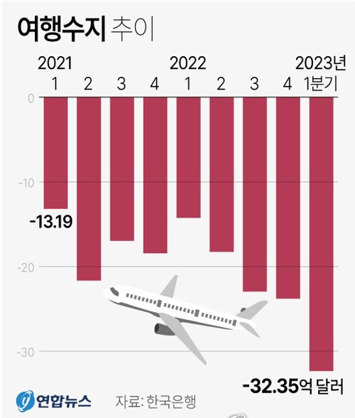 유학·연수 수지 적자 규모는 지난해 4분기 6억 1800만 달러에서 올해 1분기 6억 5000만 달러로 5.2% 증가에 그쳤지만, 관광수지 적자는 같은 기간 17억 6100만 달러에서 25억 8500만 달러로 46.8% 급증했다.