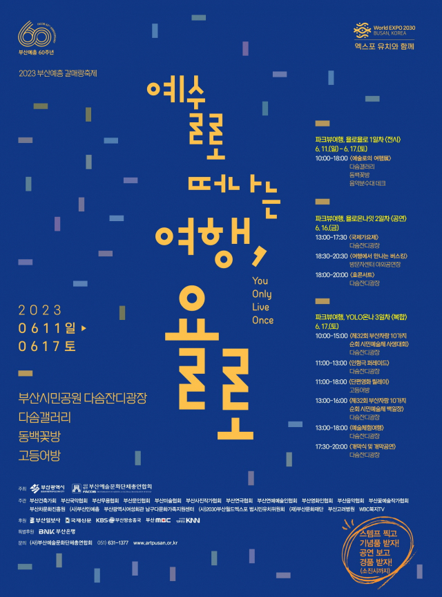 부산시와 (사)부산예술문화단체총연합회(이하 부산예총)가 공동 주최하는 2023 부산예총 갈매랑 축제 ‘예술로 떠나는 여행, 욜로’가 6월 11~17일 부산시민공원 일원에서 열린다.