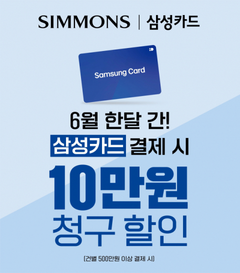 시몬스-삼성카드 프로모션은 6월 한 달간 소비자가 전국 시몬스 갤러리와 시몬스 맨션 그리고 자사몰에서 삼성카드로 500만원 이상 결제 시, 10만원의 청구할인 혜택을 받을 수 있다.