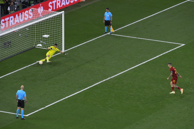 세비야의 골키퍼 야신 부누가 1일(한국시간) 헝가리 부다페스트의 푸슈카시 스타디움에서 열린 2022-2023 유럽축구연맹(UEFA) 유로파리그(UEL) 결승전 승부차기에서 AS로마의 잔루카 만치니의 슈팅을 발로 막아 내고 있다. EPA연합뉴스