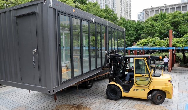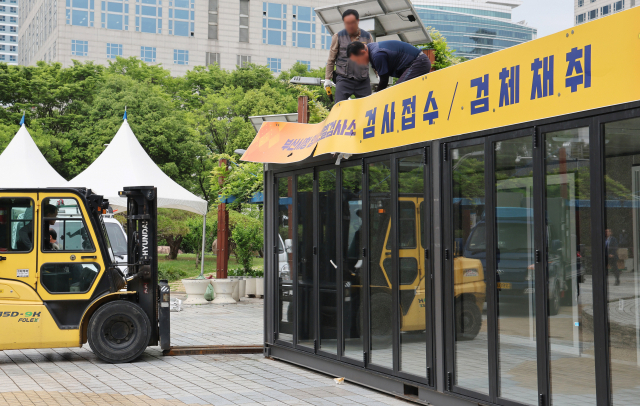 코로나19 위기경보 단계가 ‘심각’에서 ‘경계’로 하향 조정되면서 1일부터 부산시청 등대광장에 설치된 임시선별검사소 운영이 종료돼 관계자들이 검사소를 철거하고 있다.
