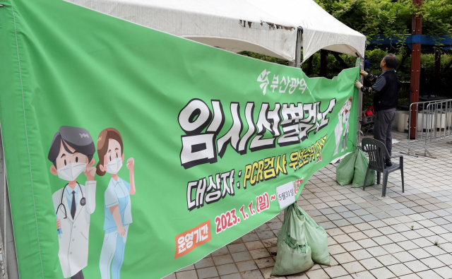 1일부터 부산시청 등대광장에 설치된 임시선별검사소 운영이 종료돼 검사소 입구에 운영 종료를 안내하는 현수막이 걸려 있다. 정종회 기자 jjh@