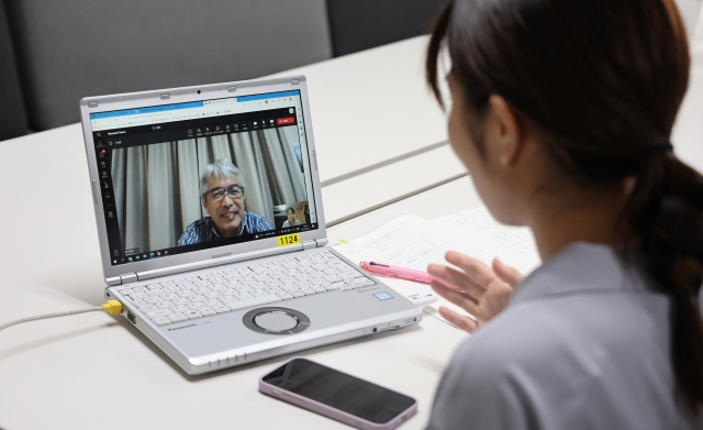 <부산일보>에 파견 근무 중인 이와사키 사야카 서일본신문 기자가 일본 후쿠오카시의 히키코모리 지원 단체 ‘야오키주쿠’의 도스 마사하루 대표와 최근 화상 인터뷰를 하고 있다. 이재찬 기자 chan@