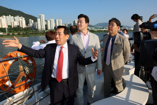 나동연 양산시장과 윤영석 국회의원, 낙동강 협의체 소속 자치단체장이 낙동강 생태탐방선에 탑승에 낙동강 뱃길 복원에 대한 공감대를 갖고 있다.양산시 제공