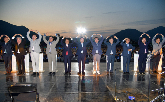 3일 황산공원에서 열린 황산가든페스티벌-황산리버사이드 콘서트에서 박완수 경남도지사와 안병윤 부산시 행정부시장, 낙동강 협의체 소속 자치단체장이 축제를 찾은 방문객에게 ‘사랑한다’는 포즈를 취하고 있다. 양산시 제공