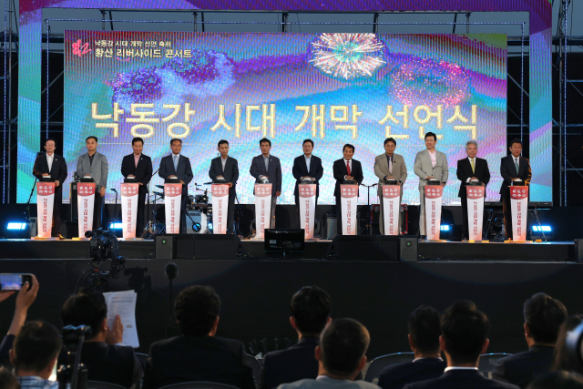 양산시는 3일 황산공원에서 열린 황산가든페스티벌-황산리버사이드 콘서트에서 ‘낙동강 시대 개막 선언식’을 하고 있다. 양산시 제공