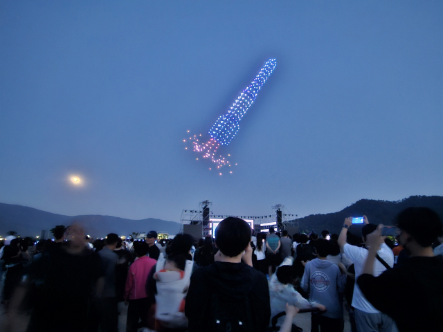 황산가든페스티벌-황산리버사이드 콘서트에서 경남도의 우주항공청 설치를 기원하는 드론 쇼가 펼쳐지고 있다. 김태권 기자