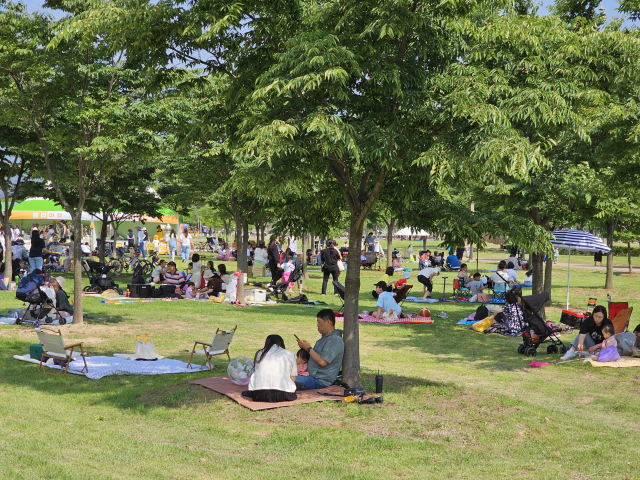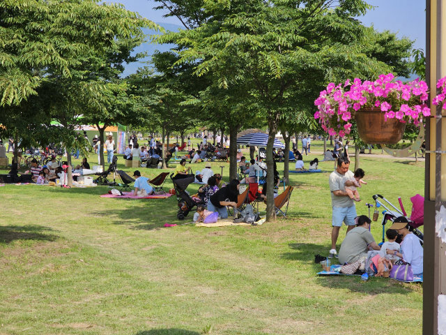 황산가든페스티벌에 참여한 양산시민과 방문객이 나무 그늘에 옹기종기 모여 즐거운 시간을 보내고 있다. 김태권 기자