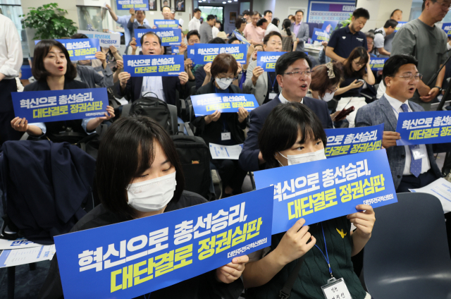 4일 서울 여의도 더불어민주당 중앙당사에서 열린 '더민주전국혁신회의'(더혁신회의) 출범식에서 참석자들이 구호를 외치고 있다. 민주당 원외인사들이 중심이 된 모임인 '더혁신회의'는 지역위원장·당직자, 문재인 정부 청와대 출신 인사들이 참여했으며 김우영 강원도당위원장이 상임운영위원장을 맡았다. 연합뉴스