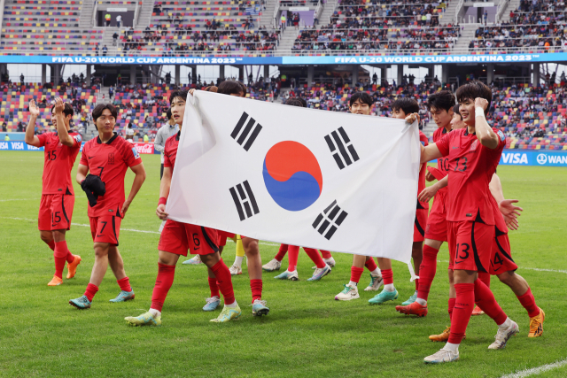 5일(한국시간) 아르헨티나 산티아고 델 에스테로 스타디움에서 열린 2023 국제축구연맹(FIFA) 20세 이하(U-20) 월드컵 8강전 한국과 나이지리아의 경기에서 연장전 끝에 1:0으로 승리를 거둔 대표팀 선수들이 태극기를 앞세운 채 경기장을 돌며 자축하고 있다. 연합뉴스