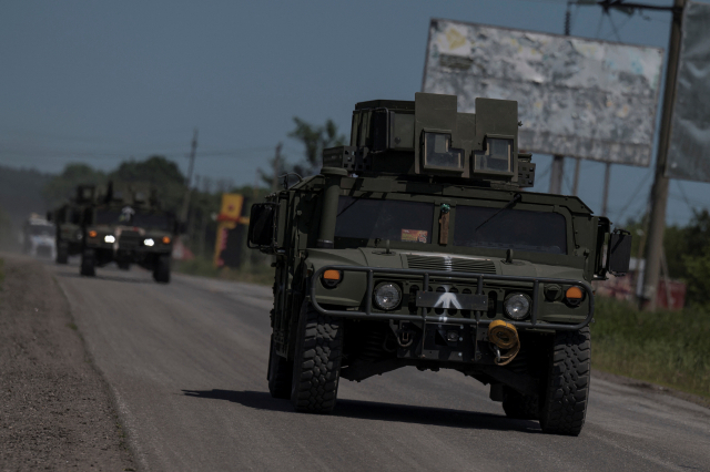 4일(현지 시간) 우크라이나 하르키우 지역에서 험비 군용 차량이 우크라이나-러시아 접경지 인근 도로를 달리고 있다(위). 우크라이나 병사들이 이날 하르키우의 러시아 접경지 인근에서 작전 준비를 하고 있다. 로이터연합뉴스