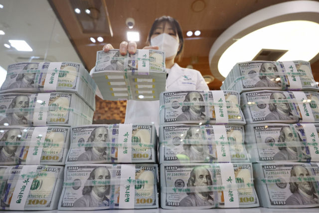 한은이 5일 발표한 통계에 따르면 미국 달러 강세와 환율 안정 조치 등의 영향으로 5월 말 기준 외환보유액은 4209억 8000만 달러(약 551조 원)로 지난 4월 말보다 57억달러 감소했다. 이날 하나은행 본점 위변조대응센터에서 한 직원이 달러를 정리하고 있다. 연합뉴스