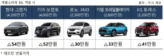 또 르노 XM3 2300만원 차량은 30만원이 내려가고 지엠 트레일블레이저 2600만원 차량은 33만원, KG 토레스 3200만원 차량은 41만원이 인하된다.
