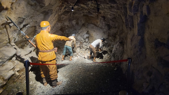 대항항 인공 동굴 안에서 볼 수 있는 조선인 강제 노역 모형. 일본군은 강원도에 있는 탄광 근로자를 징용해 땅굴을 파게 하고 암석을 나르게 했다.