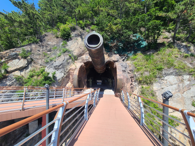 멀리 나무 덱으로 된 인공 동굴 탐방로(약 400m)가 보인다. 대항항 해안 절벽에는 일본군이 파놓은 인공 동굴이 있다. 덱 길을 따라 걸으며 인공 동굴을 탐방할 수 있다.