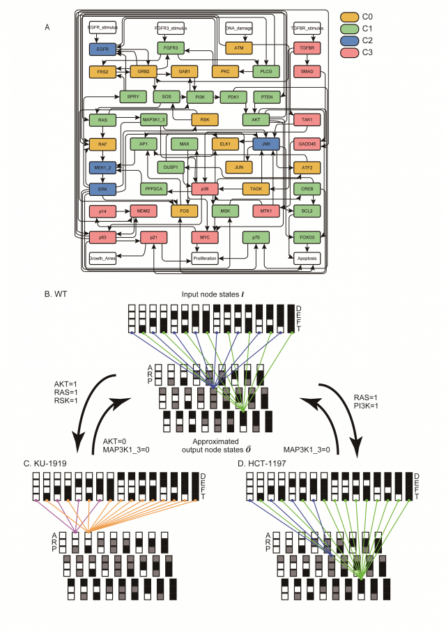 그림. 방광암 유전자 조절네트워크와 방광암 세포의 입출력 관계 회복 시뮬레이션 결과. 조광현 교수 연구팀은 방광암 유전자 조절 네트워크에서 유전자 돌연변이가 입출력 관계에 미치는 영향을 시뮬레이션 분석하여 4개의 유형으로 분류하였다(그림 A). 이를 통해 방광암 세포주 KU-1919 와 HCT-1197 의 왜곡된 입출력 관계를 정상적으로 회복시킬 수 있음을 발견하였다(그림 B). KAIST 제공