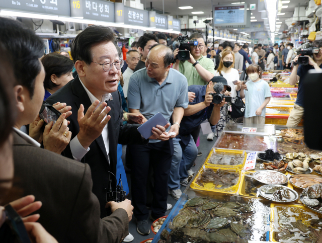 이재명 더불어민주당 대표가 지난 3일 오후 부산 중구 자갈치 시장을 찾아 상인들과 대화하고 있다. 연합뉴스