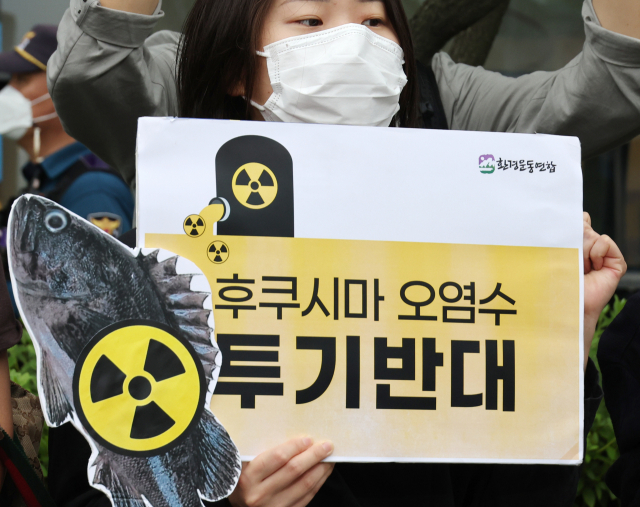 8일 서울 종로구 일본대사관 앞에서 후쿠시마 원전 오염수 해양투기에 반대하는 국제 연맹 단체 관계자들이 오염수 해양투기를 규탄하는 기자회견을 열고 구호를 외치고 있다. 연합뉴스