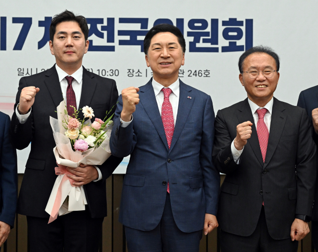 국민의힘 최고위원 보궐선거에서 당선된 김가람(왼쪽) 당 청년대변인이 9일 국회에서 김기현(가운데) 대표, 윤재옥 원내대표와 기념촬영을 하고 있다. 연합뉴스