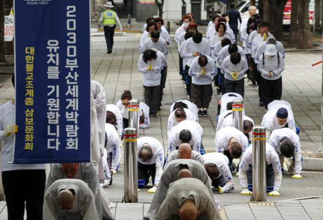 11일 화엄승가회 스님과 신도들이 부산시청 앞 광장에서 ‘2030 부산세계박람회 유치 기원 삼보일배 대정진법회’를 열고 삼보일배를 하고 있다.