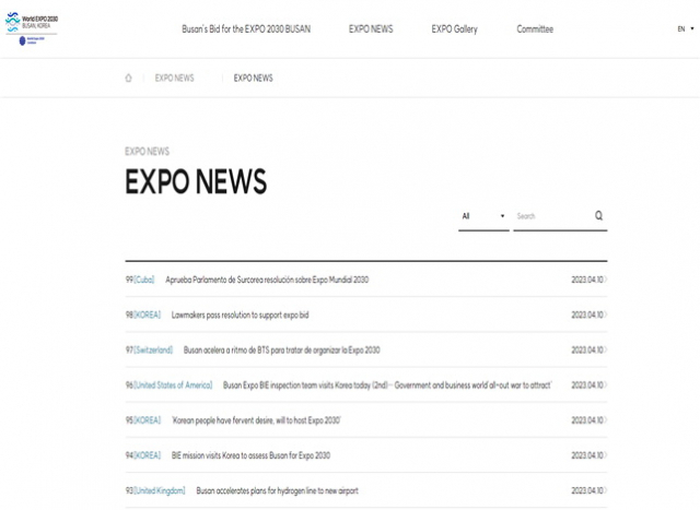 정부는 물론 기업 등 민간이 2030세계박람회(월드엑스포) 유치 활동에 사활을 쏟고 있지만, 정작 홍보 목적으로 만든 부산엑스포 홈페이지는 내용 업데이트 없이 방치된 것으로 확인됐다. 엑스포 유치 홍보를 강화하고 유치 교섭 활동에 차질이 없도록 조속한 개선이 이뤄져야 한다는 지적이 제기된다.