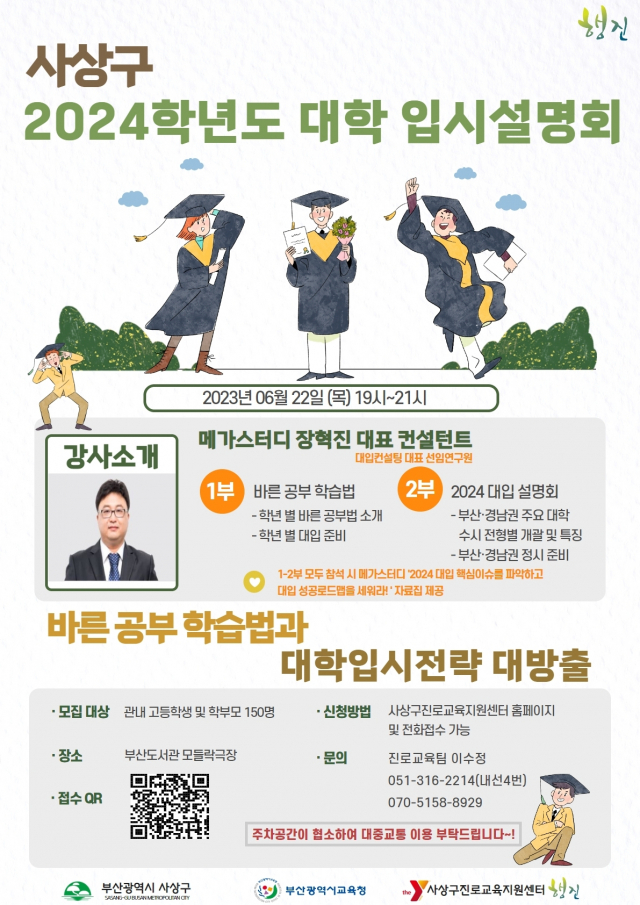 부산 사상구(구청장 조병길)는 ‘바른 공부 학습법과 대학입시전략 대방출을 위한 2024학년도 입시설명회’를 오는 22일 오후 7시 부산도서관 모들락 극장(지하 1층)에서 개최한다.