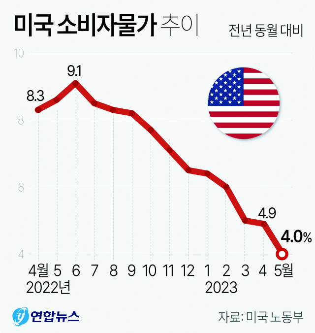 13일 발표된 미국 5월 소비자물가지수는 지난해 동기보다 4.0% 올라 2021년 3월 이후 2년 2개월 만에 오름폭이 가장 작았다.