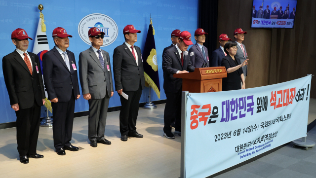 싱하이밍 주한 중국대사의 ‘베팅’ 발언으로 한중 관계가 ‘강 대 강’ 대결로 치닫고 있다. 대한민국수호예비역장성단이 14일 국회에서 싱 대사의 사죄를 촉구하는 기자회견을 하고 있다 .연합뉴스