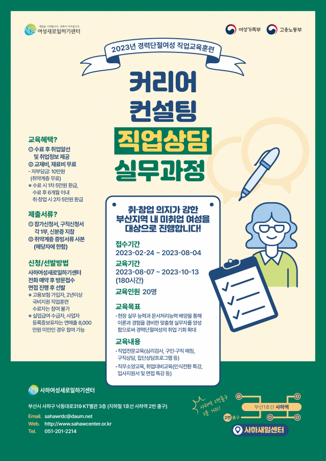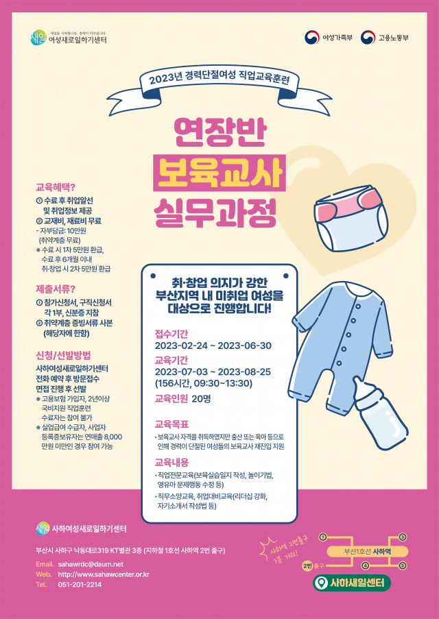 사하여성인력개발센터 여성새로일하기센터(관장 박현숙)는 '2023년 경력단절 및 미취업 여성의 직업교육훈련' 중 ‘연장반 보육교사 실무과정’과 ‘커리어컨설팅 직업상담 실무과정’ 교육생을 모집한다.