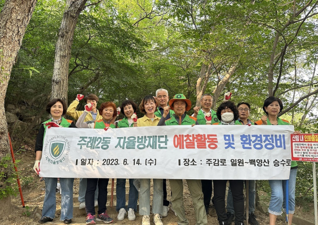 이날 방재단원들은 주례 반도보라메머드타운 뒤편 백양산 승수로에 쌓인 낙엽 등을 치우고 등산로에 방치된 쓰레기들을 수거했다. 또, 폭우 시 침수피해가 우려되는 주택가의 배수로를 점검하며 우수기 대비에 구슬땀을 흘렸다.