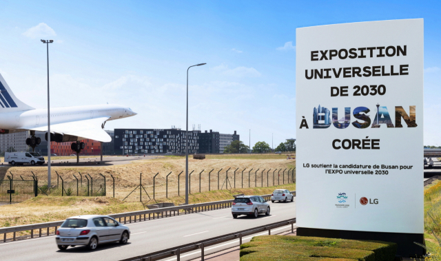 20~21일 제172차 국제박람회기구(BIE) 총회가 열릴 프랑스 파리의 샤를드골 국제공항 인근 대형 옥외광고판에 LG그룹이 게재한 '2030부산세계박람회(월드엑스포)' 유치 응원 광고가 보인다. 연합뉴스
