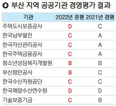 부산에 있는 중앙부처 소속 공공기관으로 이번 평가 대상은 모두 9곳이다. 2021년에는 한국남부발전과 한국자산관리공사가 우수(A) 등급을 받았으나 두 곳은 이번에 보통(C)을 받았다. 남부발전은 영업이익이 530억 원에서 56억 원으로 하락했고 한국자산관리공사도 423억 원에서 251억 원으로 감소한 것 등이 영향을 미친 것으로 보인다.
