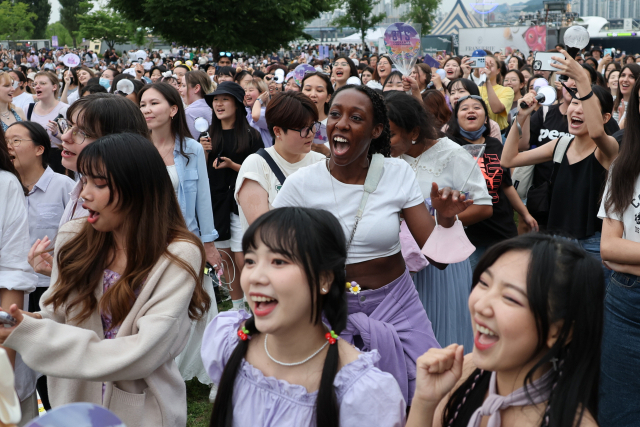 지난 17일 오후 방탄소년단(BTS)의 데뷔 10주년 기념 축제가 열린 서울 여의도 한강공원에서 전 세계 아미(BTS 팬)들이 모여 BTS 음악에 맞춰 춤을 추며 흥겨워하고 있다. 연합뉴스