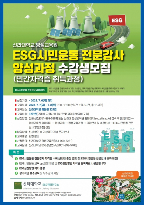 신라대학교(총장 허남식)는 ESG시민운동 전문강사 양성과정 수강생을 모집한다고 19일 밝혔다.
