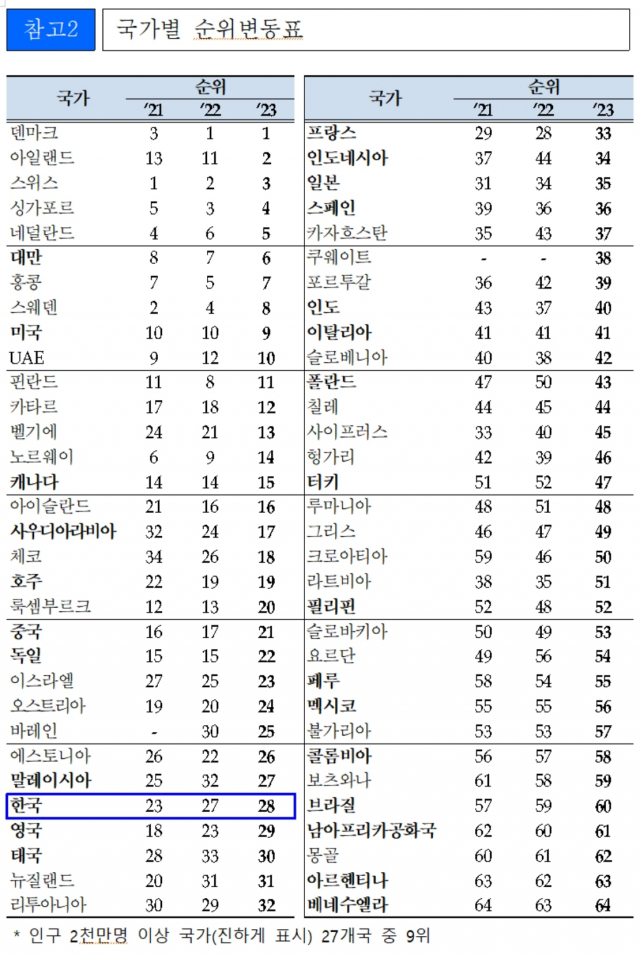 IMD 국가경쟁력, 한국 64개국 중 28위…전년보다 1계단↓