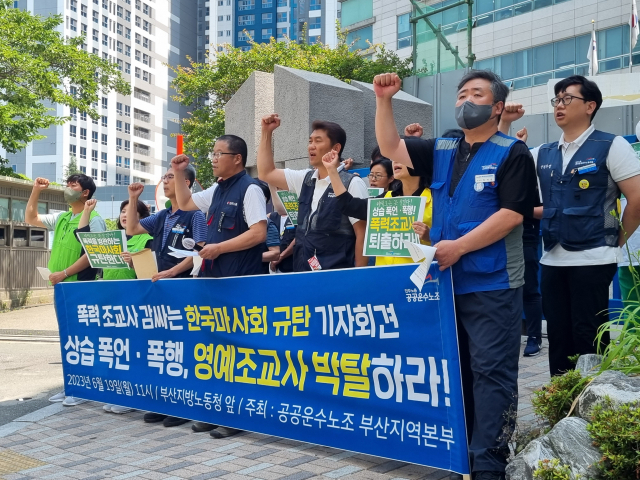 민주노총 공공운수노조는 19일 부산고용노동청 앞에서 폭언·폭행 논란이 불거진 A 조교사의 영예조교사 자격 박탈 등을 촉구했다.