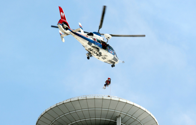 20일 오전 부산 해운대구 중동의 한 호텔 지하 주차장에서 불이나 소방당국이 소방 헬기를 활용해 옥상으로 대피한 투숙객을 구조하고 있다. 정종회 기자 jjh@